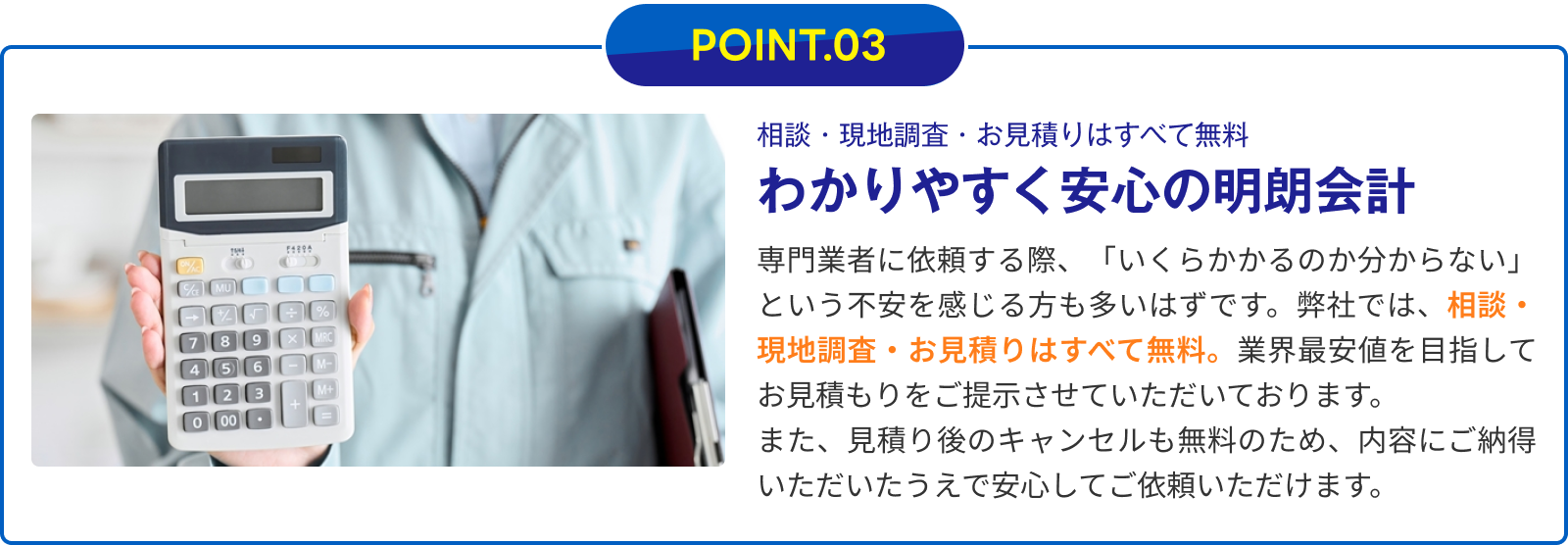 お見積もり内容をご確認いただいたうえで、作業前であればキャンセルしていただいて問題ありません。お見積もり後に無理な営業や強引な作業の開始は一切行いませんので、金額や内容にご納得いただけない場合はその場でお断りいただいて大丈夫です。安心してご相談ください。